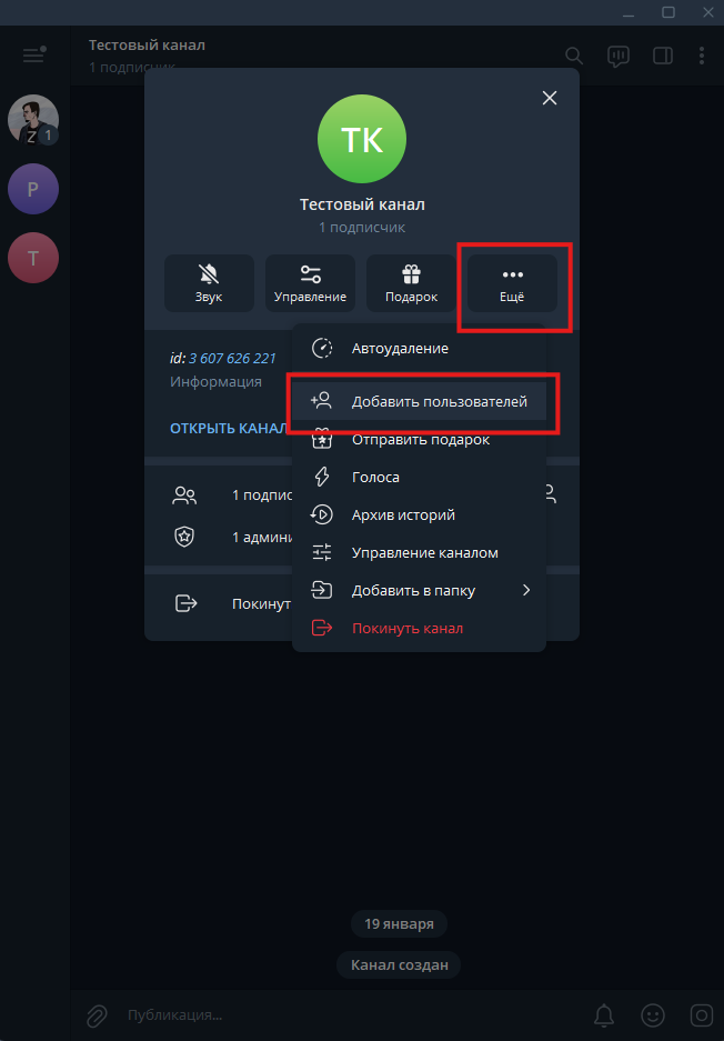- Откройте свой канал. Нажмите на название канала, а затем на кнопку «Ещё». В появившемся меню выберите «Добавить пользователей».