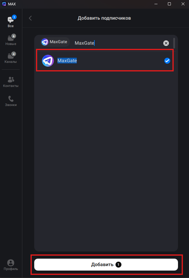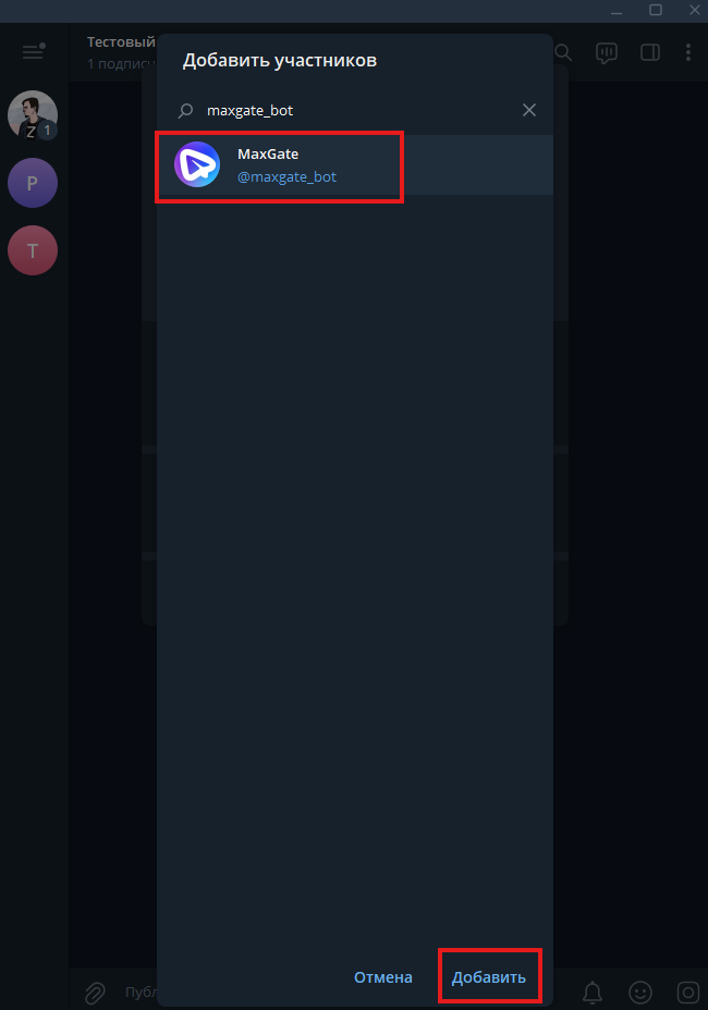 2. Введите в поиске «maxgate_bot» и выберите бота MaxGate. Если бот не отображается в поиске, попробуйте отправить ему любое сообщение: t.me/maxgate_bot. Не волнуйтесь, если бот не ответит на него, это ожидаемое поведение. Нажмите кнопку «Добавить», чтобы продолжить.