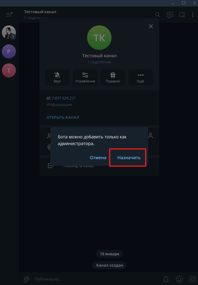 3. Telegram запросит подтверждение назначения бота администратором канала. Не беспокойтесь, у бота не будет возможности вносить изменения в канал или публиковать посты. Мы настроим права в следующем шаге.