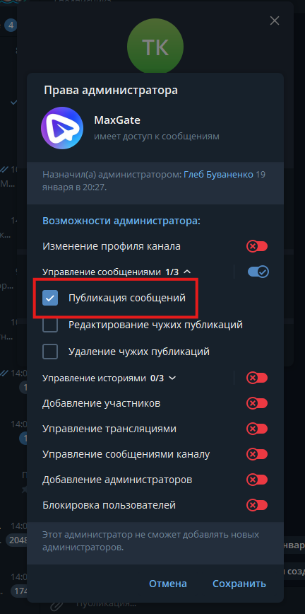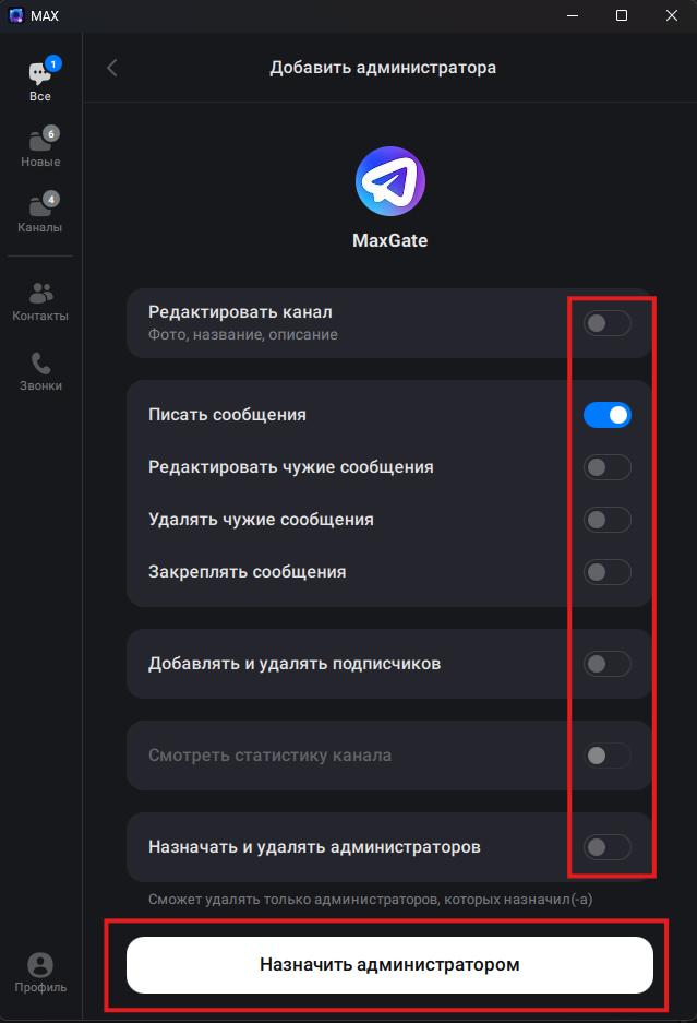 4. Вернитесь назад, перейдите в пункт «Администраторы» и нажмите кнопку «Добавить администратора». В появившемся меню выберите бота MaxGate. Оставьте право только на написание сообщений и нажмите «Назначить администратором».