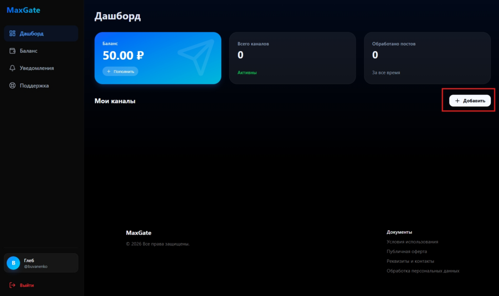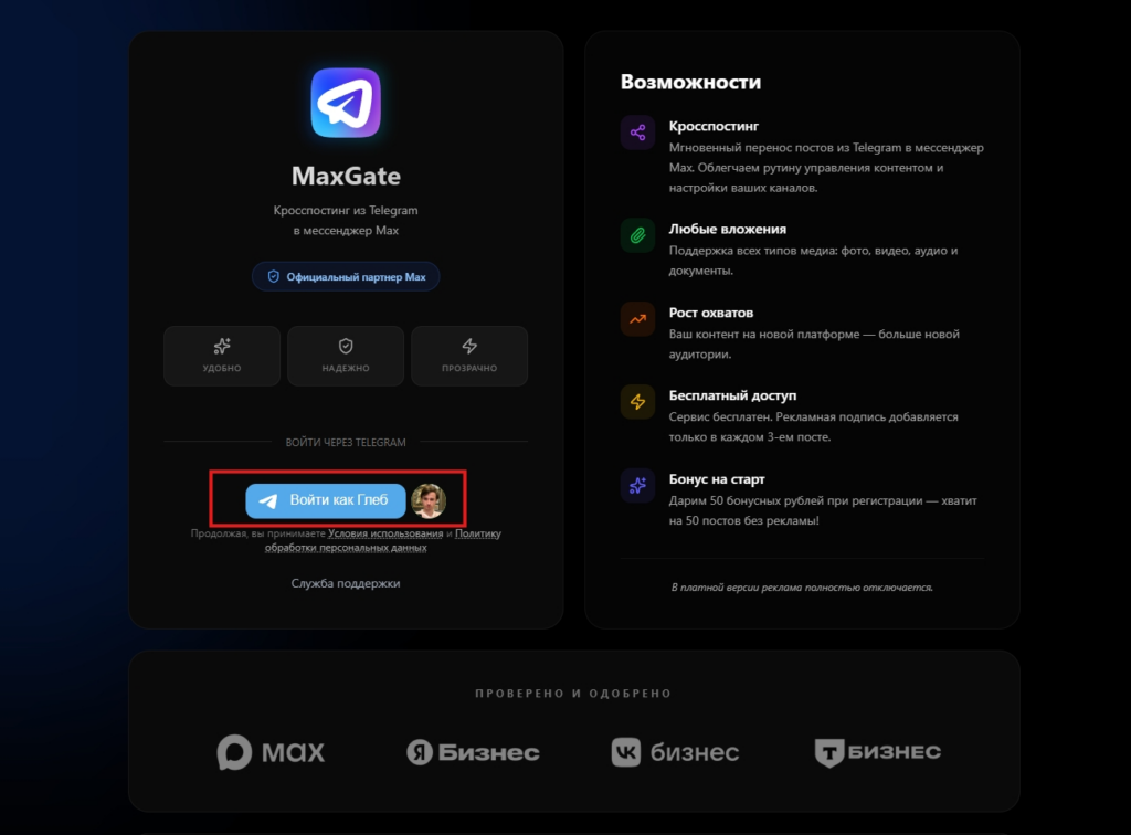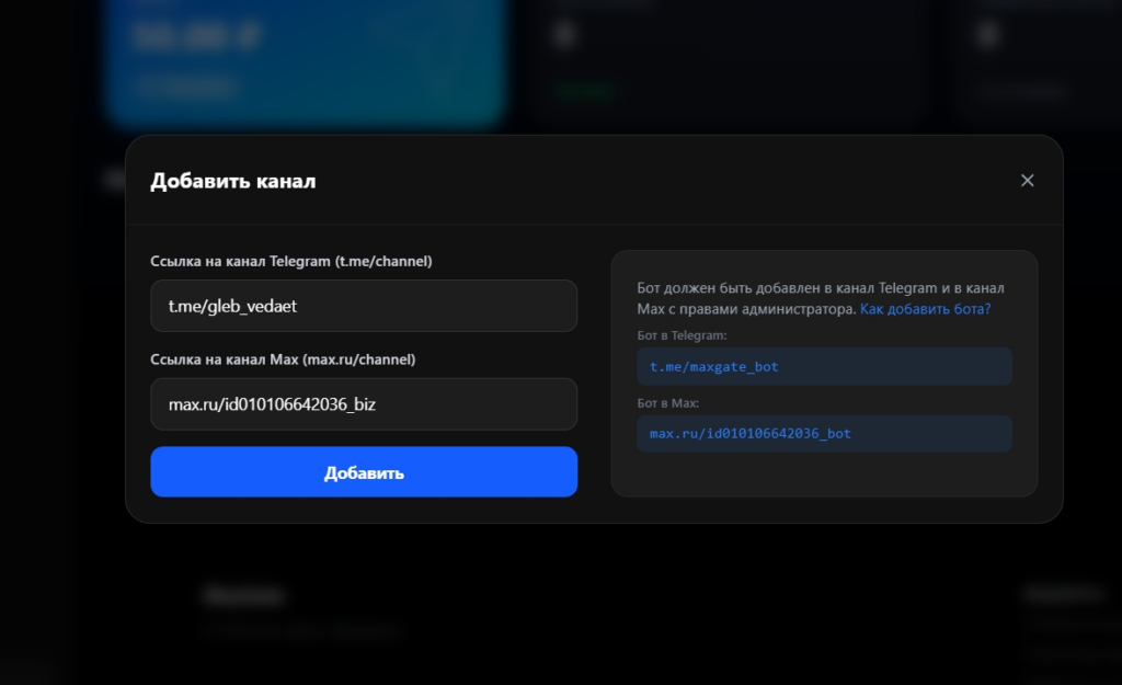 Для этого достаточно добавить нашего бота в администраторы обоих каналов и связать их через панель управления MaxGate. После этого сервис кросспостинга начнет работать автоматически.