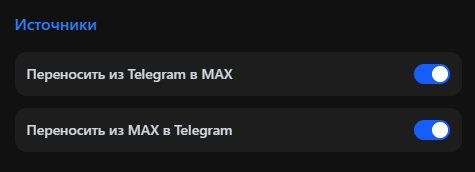 Позволяет настроить источники для переноса. Посты могут переноситься как из Telegram в MAX, так и из MAX в Telegram.