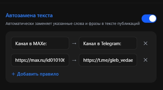 Пример использования: Вы можете публиковать в Telegram ссылку на канал в Max, а при переносе в Max автоматически подменять её ссылкой на Telegram-канал.