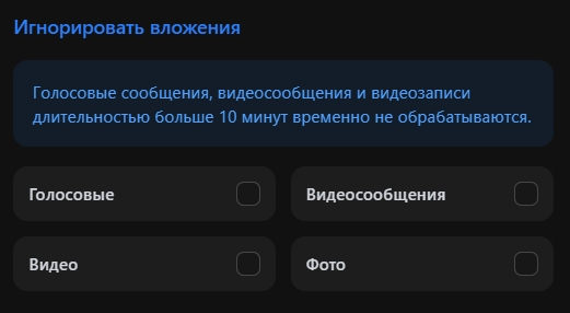 Можно выбрать типы медиафайлов, которые не должны переноситься в канал Max: голосовые сообщения, видеосообщения, видеоролики и фотографии.