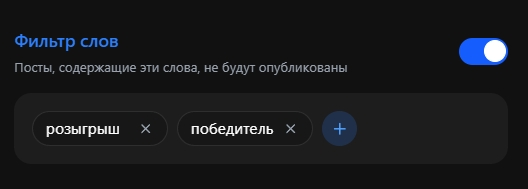 Пример использования: Если вы проводите розыгрыш только для аудитории Telegram и не хотите дублировать эти посты в Max, достаточно добавить слова «розыгрыш», «конкурс» и другие связанные фразы в фильтр. Все такие публикации будут автоматически пропущены.